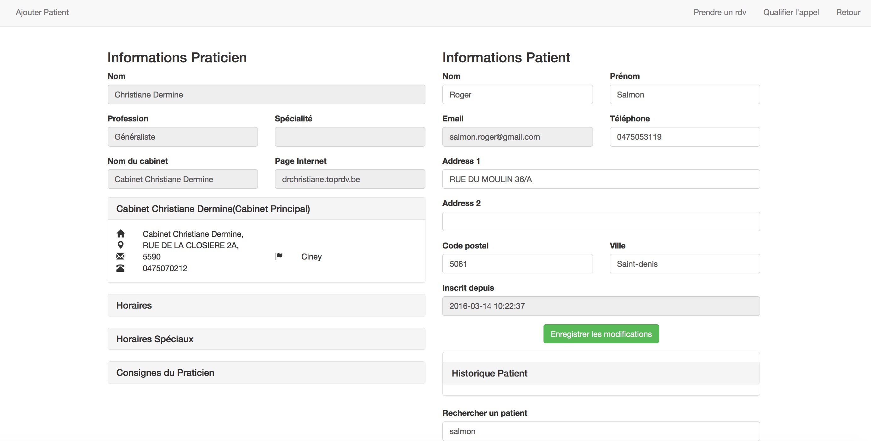 L’application permet la tenue d’un agenda par praticien avec possibilité pour les patients de prendre rendez-vous en ligne avec bien sûr le rappel par mail et/ou SMS.